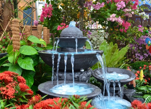Fountains fall into two main categories: freestanding and tabletop. Freestanding fountains suit garden centers or corners—for example, a vintage bronze European-style fountain paired with roses creates romantic flair, while a Japanese bamboo spout with pebbles and moss offers a tranquil, Zen-like mood. Tabletop fountains are compact, perfect for terraces, balconies, or low garden walls. They can even be paired with glass aquariums for creative “spray above, fish below” designs—ideal for small gardens.